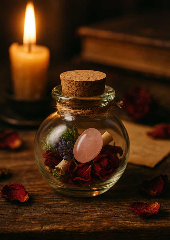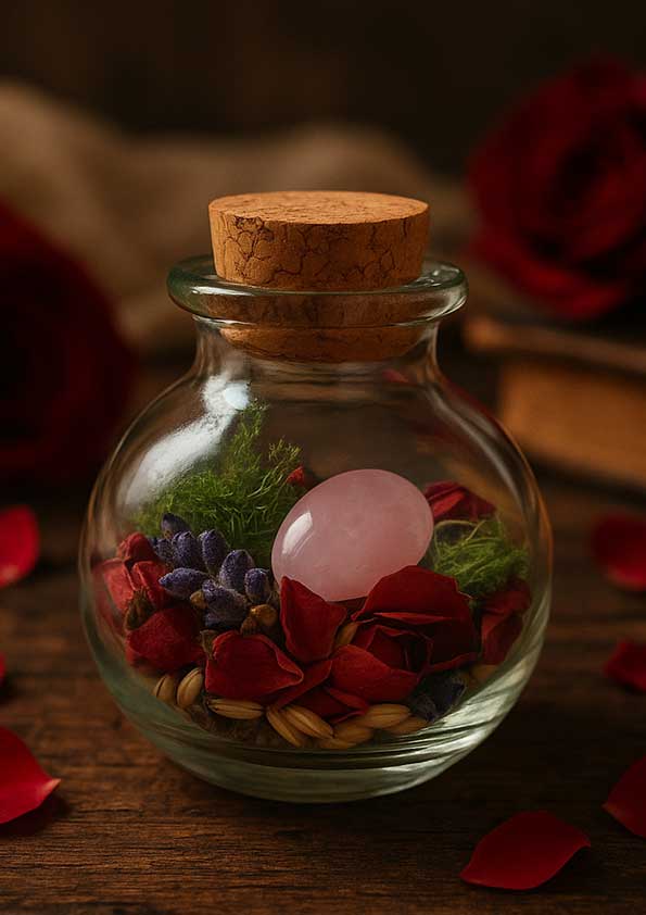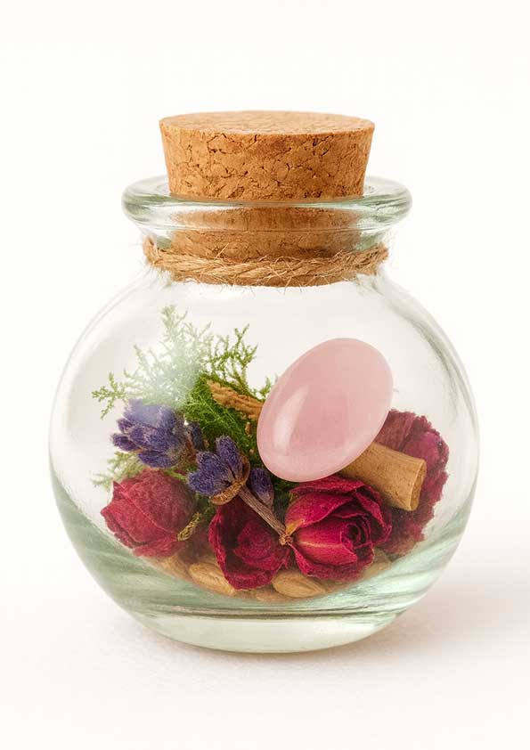 Każdy Rytuał na miłość został zamknięty w szklanej buteleczce z naturalnym korkiem, która chroni energię i pozwala zachować magiczne wibracje miłości. W jej wnętrzu znajdują się suszone kwiaty i zioła miłosne – róża, lawenda – rośliny znane od stuleci ze swojej mocy wzmacniania uczuć i więzi. Całość uzupełnia liścik z intencją i zaklęciem, który nadaje talizmanowi indywidualną moc. Każda buteleczka zawiera również naturalny kamień różowego kwarcu – nazywanego kamieniem serca i miłości.