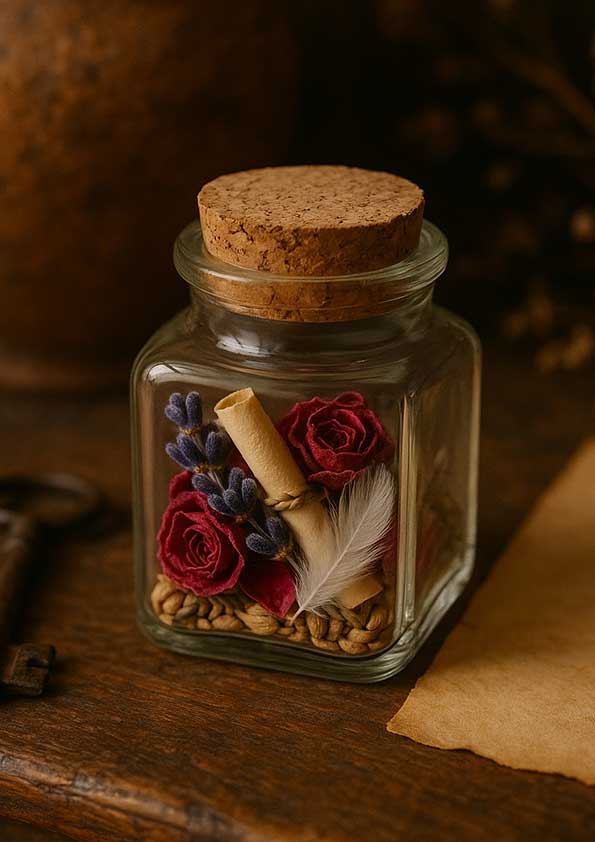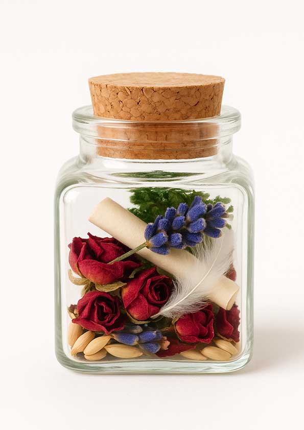 - materiał: szkło + naturalny korek (zamyka energię i intencję)