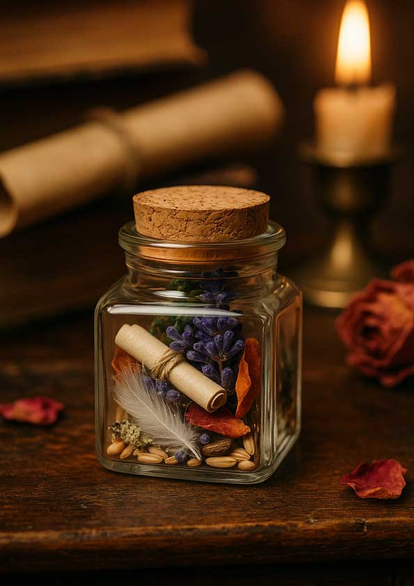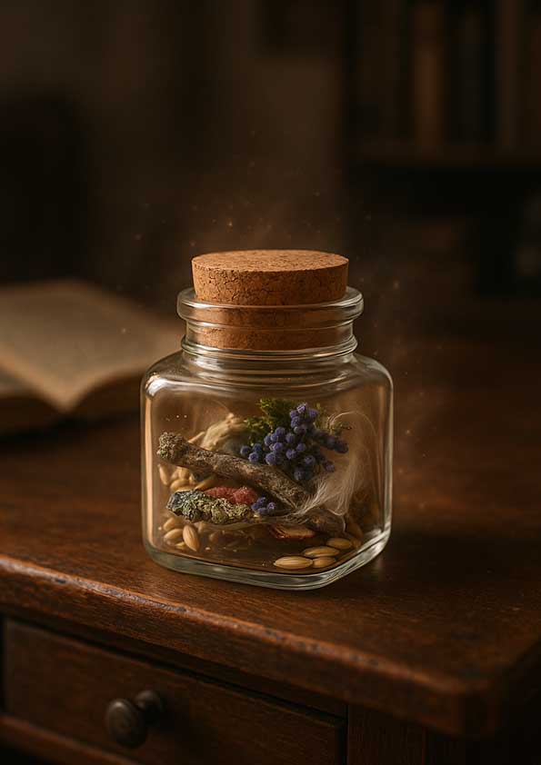 Każdy Rytuał na Szczęście zamknięty został w szklanej buteleczce z naturalnym korkiem, który chroni energię i pozwala zachować subtelne, pozytywne wibracje. W jej wnętrzu znajdują się suszone zioła i kwiaty – rośliny od wieków kojarzone z ochroną, dobrobytem i szczęściem.