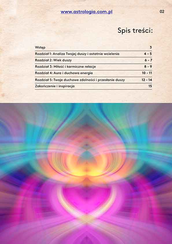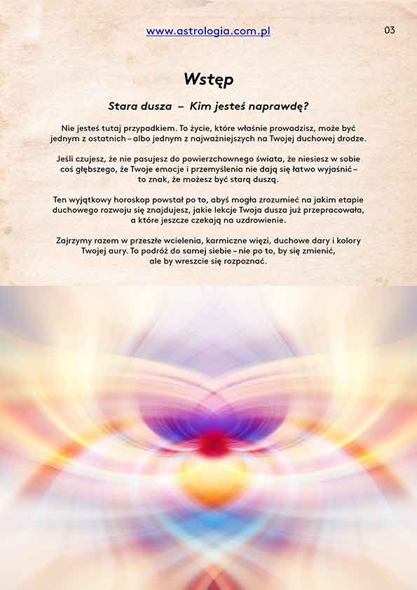 „Stara dusza: ostatnie wcielenia, wiek, miłość i aura” to około 10 stron indywidualnej analizy, która pomaga zrozumieć, kim jest Twoja dusza, skąd przychodzi i dokąd zmierza.